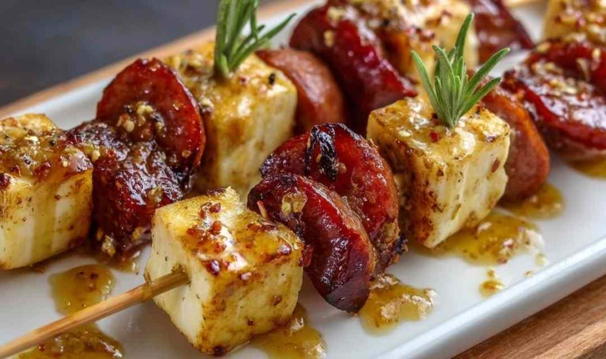 - Die Spieße 10-15 Minuten backen oder grillen, bis der Käse leicht schmilzt und die Wurst goldbraun wird.