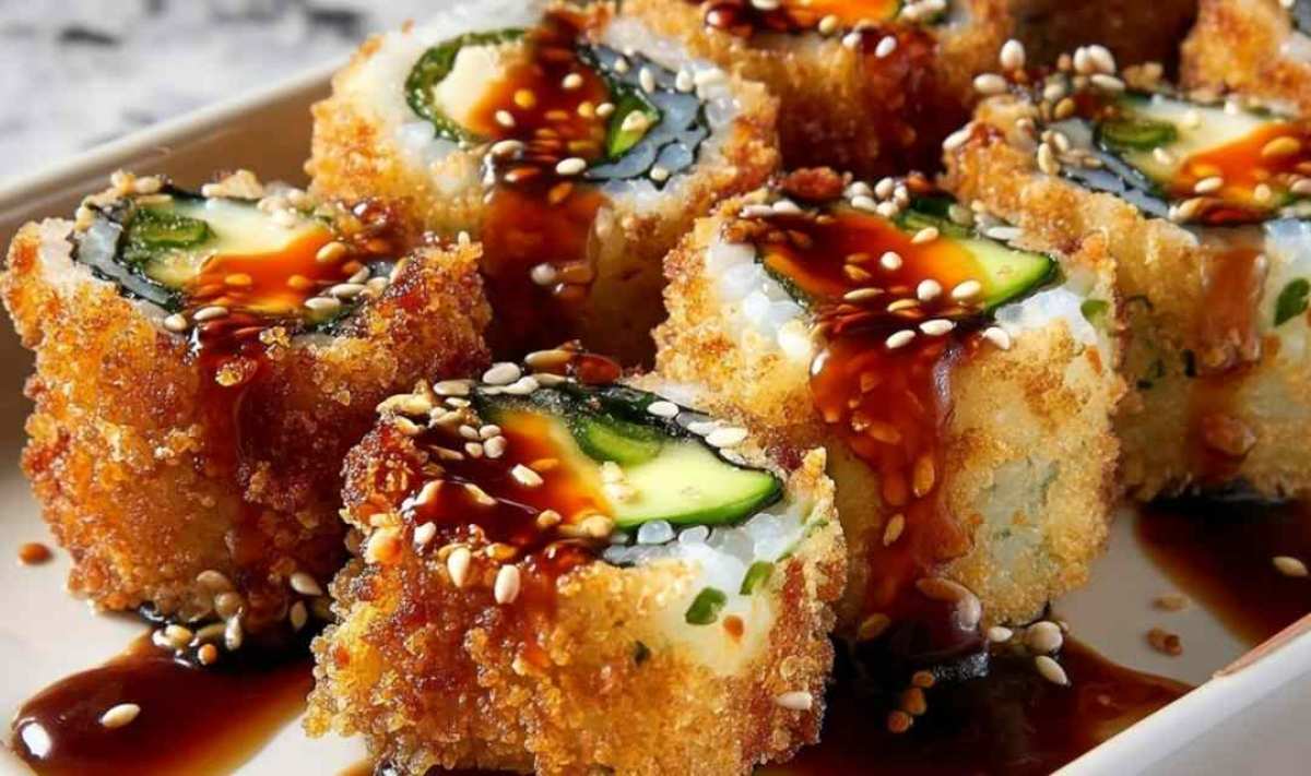 Frittierte Sushi-Rollen mit goldbrauner Panko-Sesam-Kruste und süßer Teriyaki-Sauce