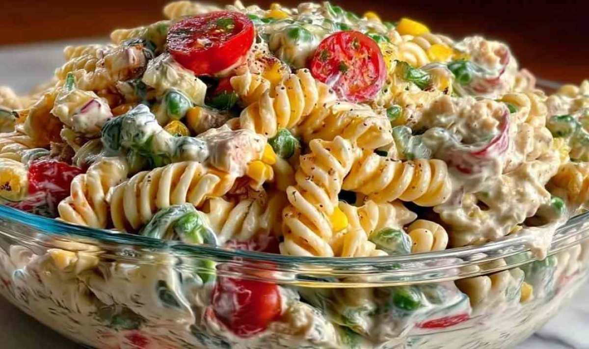 Dieser cremige Nudelsalat mit Joghurt Soße ist mehr als nur ein einfaches Gericht – er ist eine Erinnerung an sonnige Familienausflüge und gemütliche Abende im Garten.